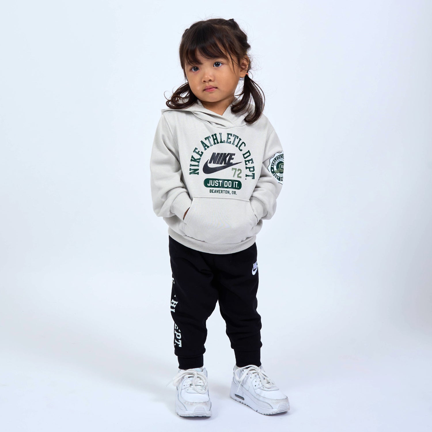 カレッジロゴのようなデザインが魅力的なパーカーとパンツのセット。パーカーには小物類を収納できるカンガルーポケットが付いています。フィット感を演出するパンツの裾のリブ切り替えもポイント。季節の変わり目のアクティブシーンに重宝したいアイテムです。[スポーツ 男の子 女の子 子供服][NIKE]
