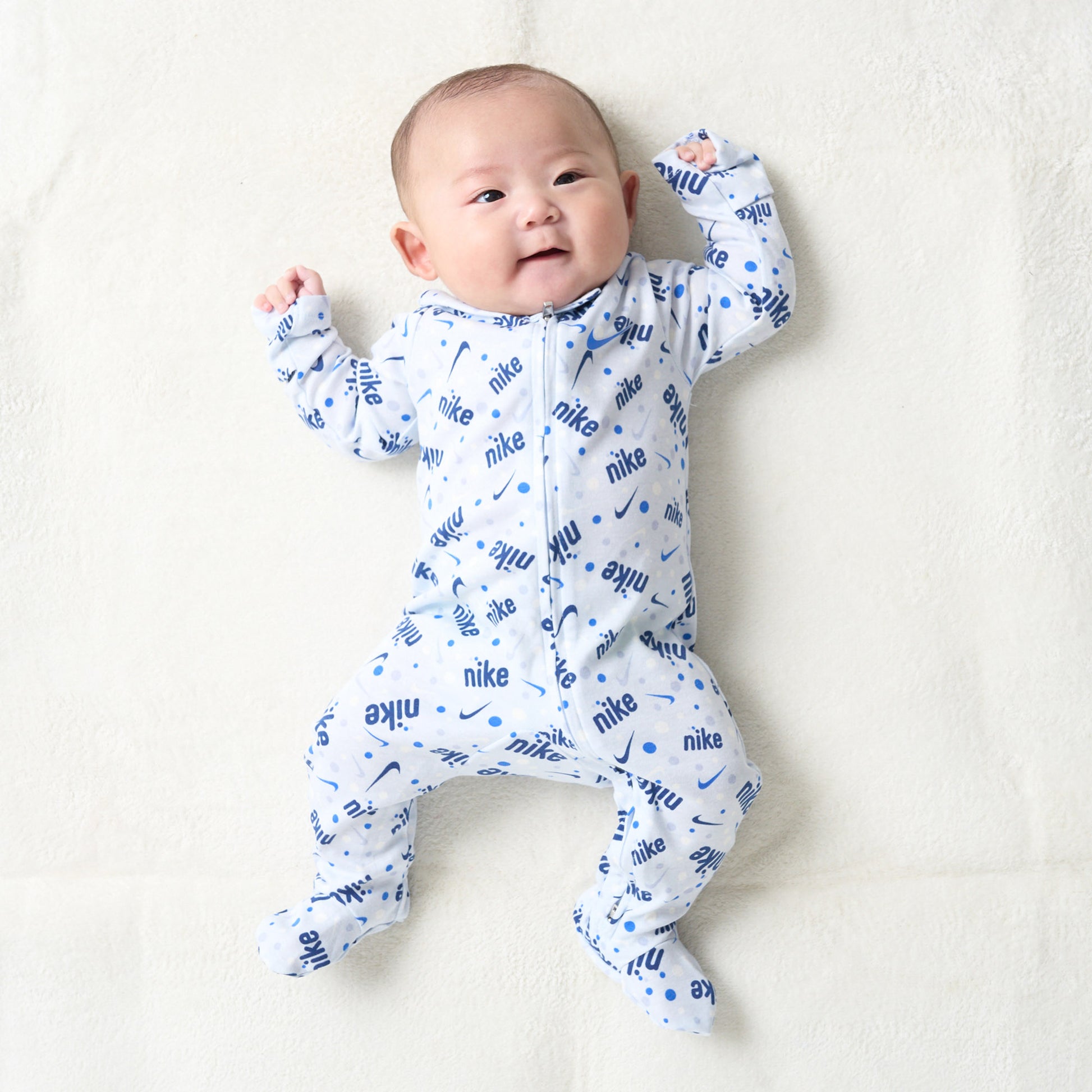 NIKEのロゴがたっぷりと散りばめられたロンパース。足先まで覆うデザインになっているので、安全性が高く暖かい着心地を演出します。首元のバンドがポイント。デイリーユースやアクティブシーンにもお使いいただけるアイテムです。※9ヶ月(70cm)は袖がリブ仕様となっております。※月齢のサイズによりボタン・ファスナー・ポケット・袖・裾などの仕様やデザインが異なる場合がございますのでご了承ください。[新生児 出産祝い ベビー服 赤ちゃん ベビーサイズ ベビー用品 かわいい][NIKE]