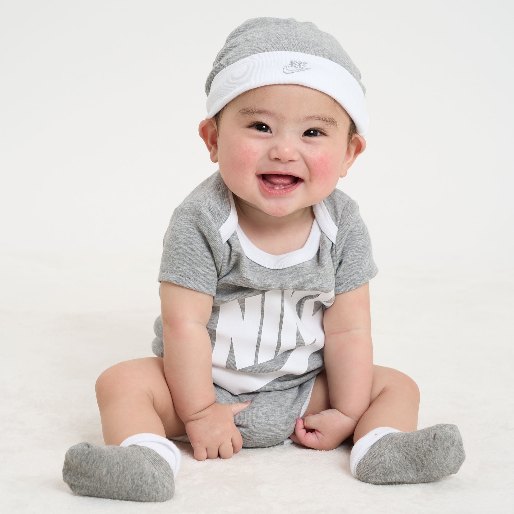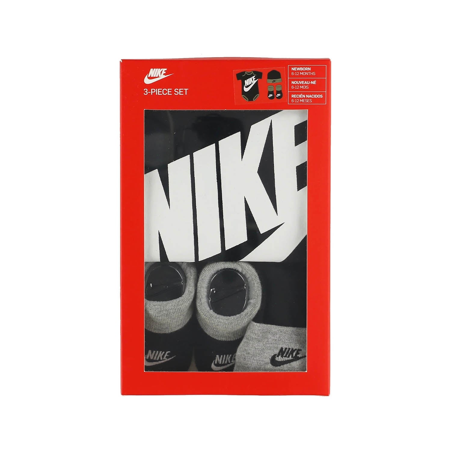 ロンパース、ハット、ソックスがセットになったギフトボックスです。クールな配色に、ロゴやスウッシュプリントを施したスタイリッシュなデザイン。素材は柔らかな綿混紡の素材です。股下がスナップボタン仕様になっているので、おむつ替えや着替えも楽にすることができます。[新生児 出産祝い ベビー服 赤ちゃん ベビーサイズ ベビー用品 かわいい][NIKE]※BOXの形状は生産時期によって異なるため、商品画像と一致しない場合がございますのでご了承ください。